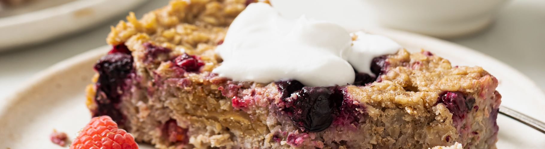 Add oats, nut or oat milk, maple, coconut oil, banana (or applesauce if using instead), peanut butter, baking powder, cinnamon, vanilla and salt. Mix to combine then fold through the berries.